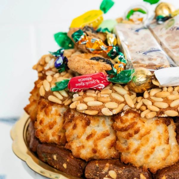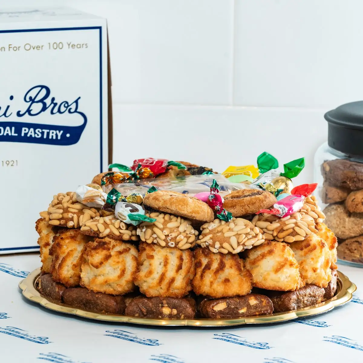 The Termini Grandioso Cookie Tray features 5 lbs. of our assorted Italian cookies assembled and decorated with imported candies and candy coated almonds. This tray serves approximately 25 people and features 8 varieties of our cookies including Pignoli, Plain Amaretti, Musticiolli, Imbutitti, Scumetti, Quorasemali, Coconut Macaroons, Blondina, and Cucidati.