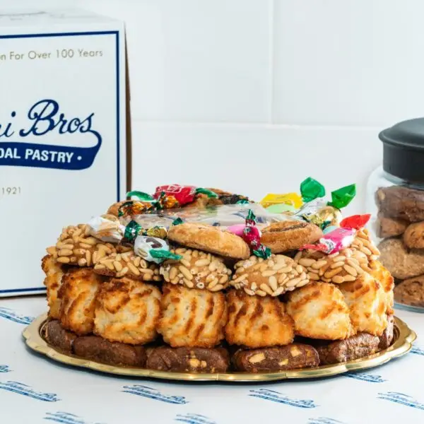 The Termini Brothers Small Signature Cookie Tin features 2 lbs. of our assorted Italian cookies assembled and decorated with imported candies and candy-coated almonds. This tray serves approximately 8-10 people and features a variety of our cookies including Pignoli, Plain Amaretti, Musticiolli, Imbutitti, Scumetti, Quorasemali, Blondina, and Cucidati.