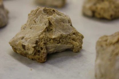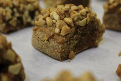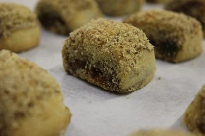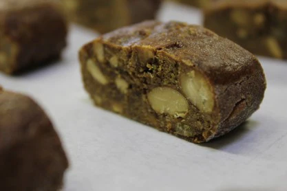 Quorasemali – Whole almonds, cashews and dried fruit are mixed into cocoa infused cookie dough, rolled into logs, baked and then cut into individual portions.