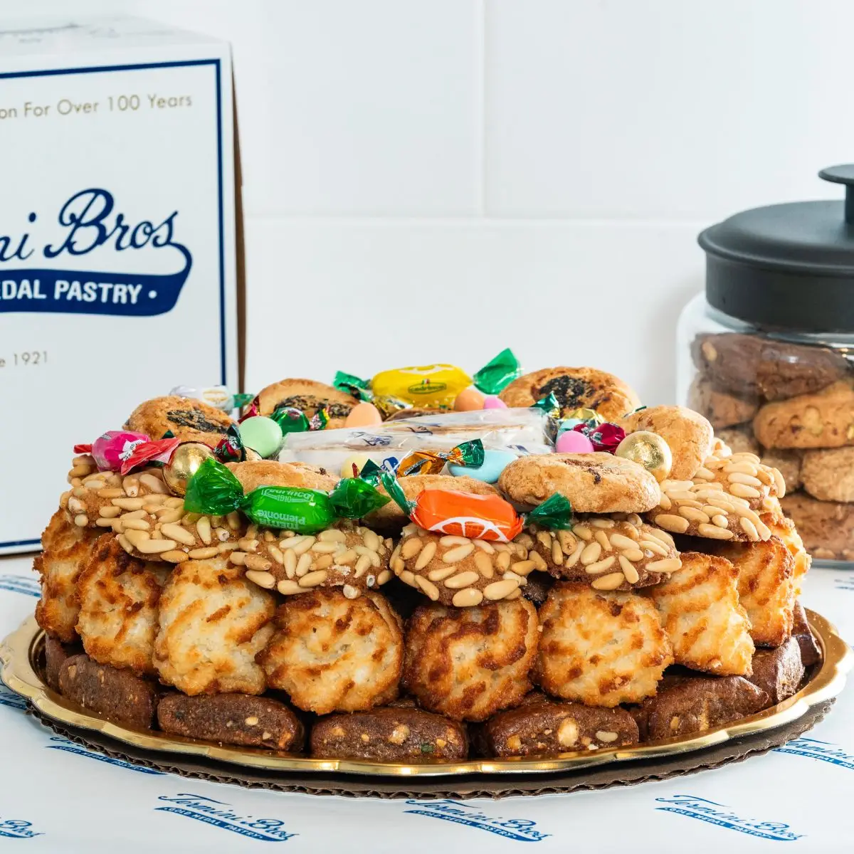 The Termini Brothers Small Signature Cookie Tin features 2 lbs. of our assorted Italian cookies assembled and decorated with imported candies and candy-coated almonds. This tray serves approximately 8-10 people and features a variety of our cookies including Pignoli, Plain Amaretti, Musticiolli, Imbutitti, Scumetti, Quorasemali, Blondina, and Cucidati.